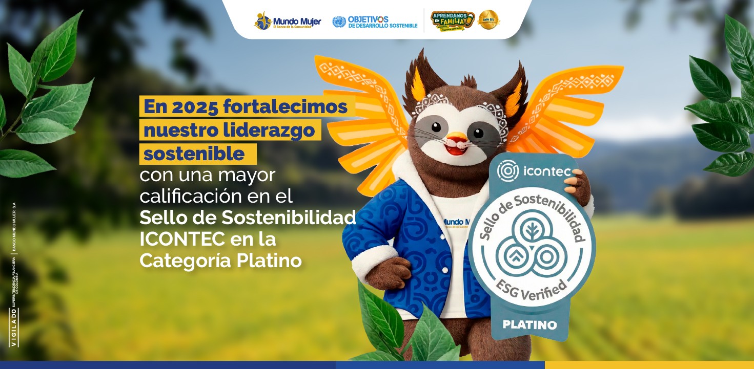 En Banco Mundo Mujer seguimos avanzando con determinación hacia un futuro más sostenible. En 2025, elevamos nuestra calificación en el Sello de Sostenibilidad ICONTEC, consolidándonos como una de las microfinancieras privadas líderes del país en la categoría Platino, la distinción más alta de esta certificación.